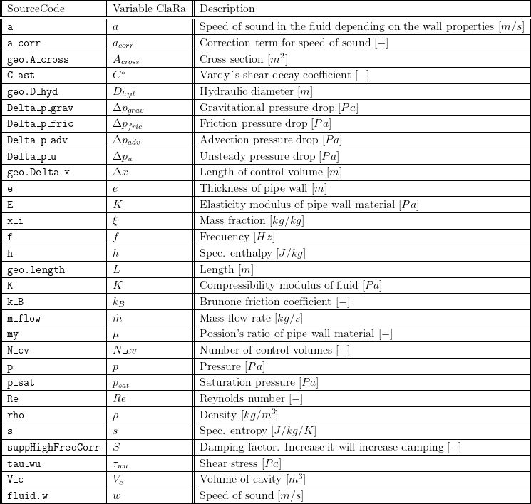 a table referencing the nomenclature in the source code, the descriptions of variables and the "human-readable" , use the following latex table template and respect the overall textwidth of 150mm:
